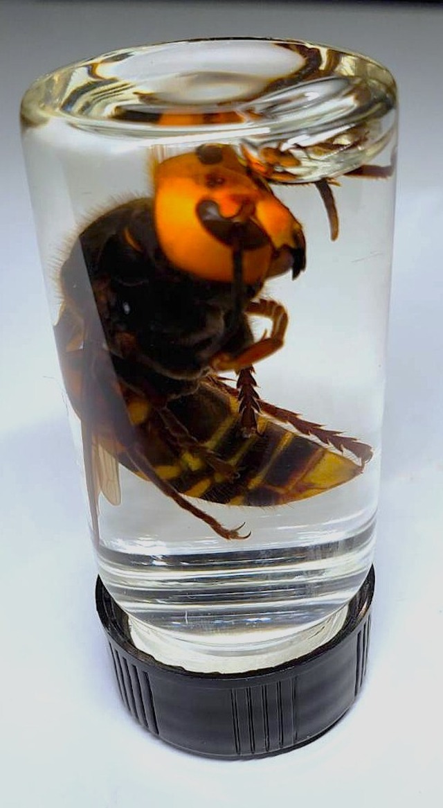 オオスズメバチエタノール標本(オスバチ) オオスズメバチのオスのエタノール液浸標本です。 ヒロポンが巣を取った際に捕獲し保存していた本物になります。 気になる方は、ぜひこの機会にお手元にてオオスズメバチの魅力を間近で感じてみてください。 ※エタノール標本は色合いや質感にムラが見られる場合がございます。予めご了承ください。 ※時間が経つと保存液・虫体に変色が見られる場合がございます。液が変色した際は70%以上の消毒用アルコールに入れ替えてください。 ※本製品は食べられません。